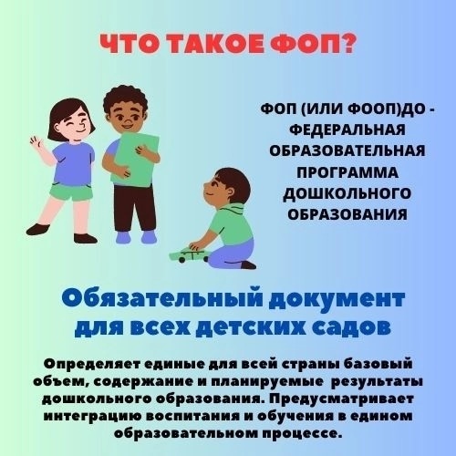 Уважаемые родители, информируем вас о том, что с сентября 2023 года все детские сады переходят на работу по новой Федеральной образовательной программе дошкольного образования. Минпросвещения приказом от 25.11 2022г. № 1028 утвердило новую ФОП ДО.ФОП ДО определяет объем, содержание, планируемые результаты обязательной части образовательной программы дошкольного образования, которую реализует детский сад. ФОП ДО заменит примерную ООП ДО. ФОП должны соответствовать все программы во всех садах с 1 сентября 2023 года. В тексте программы разработчики уточнили, что ФОП вместе со ФГОС ДО станет основой для разработки и утверждения образовательных программ в детских садах.